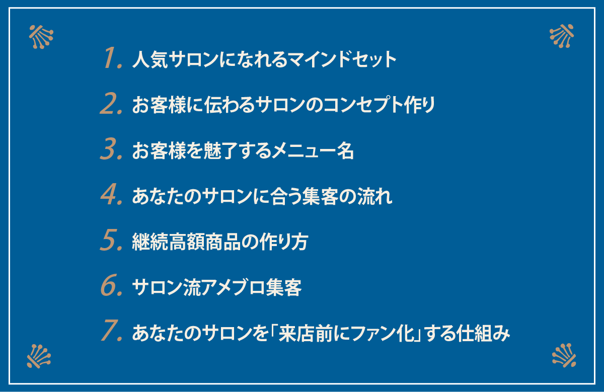 私自身のサロン立て直しのノウハウや経験はもちろんですが、250名以上のクライアントさんを7割以上、短期間で成果を上げてきた実績を元に、有料並みの情報をお届けします。サロン集客に直結する内容になっています。